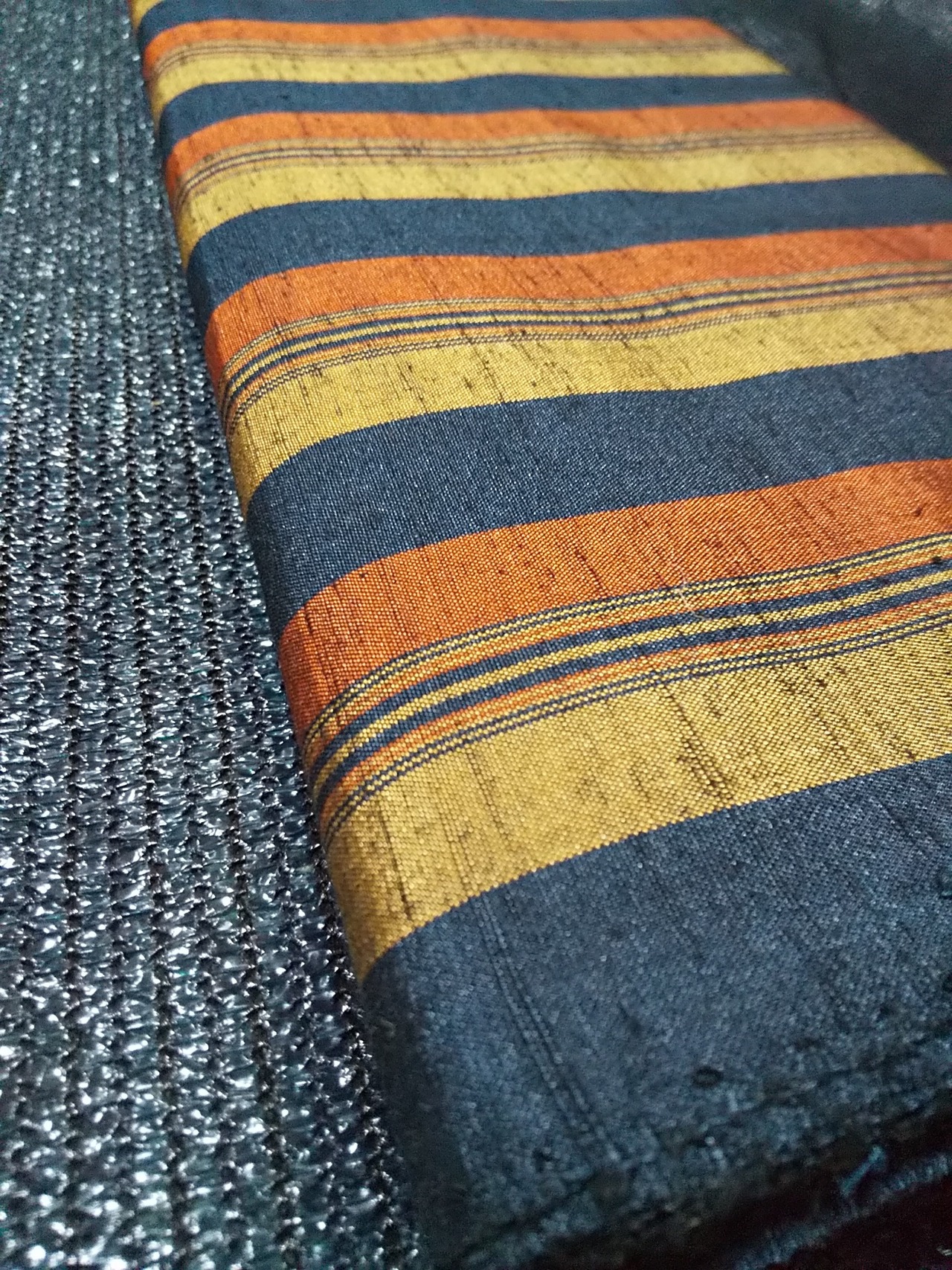 黄オレンジ青3色ストライプ生地