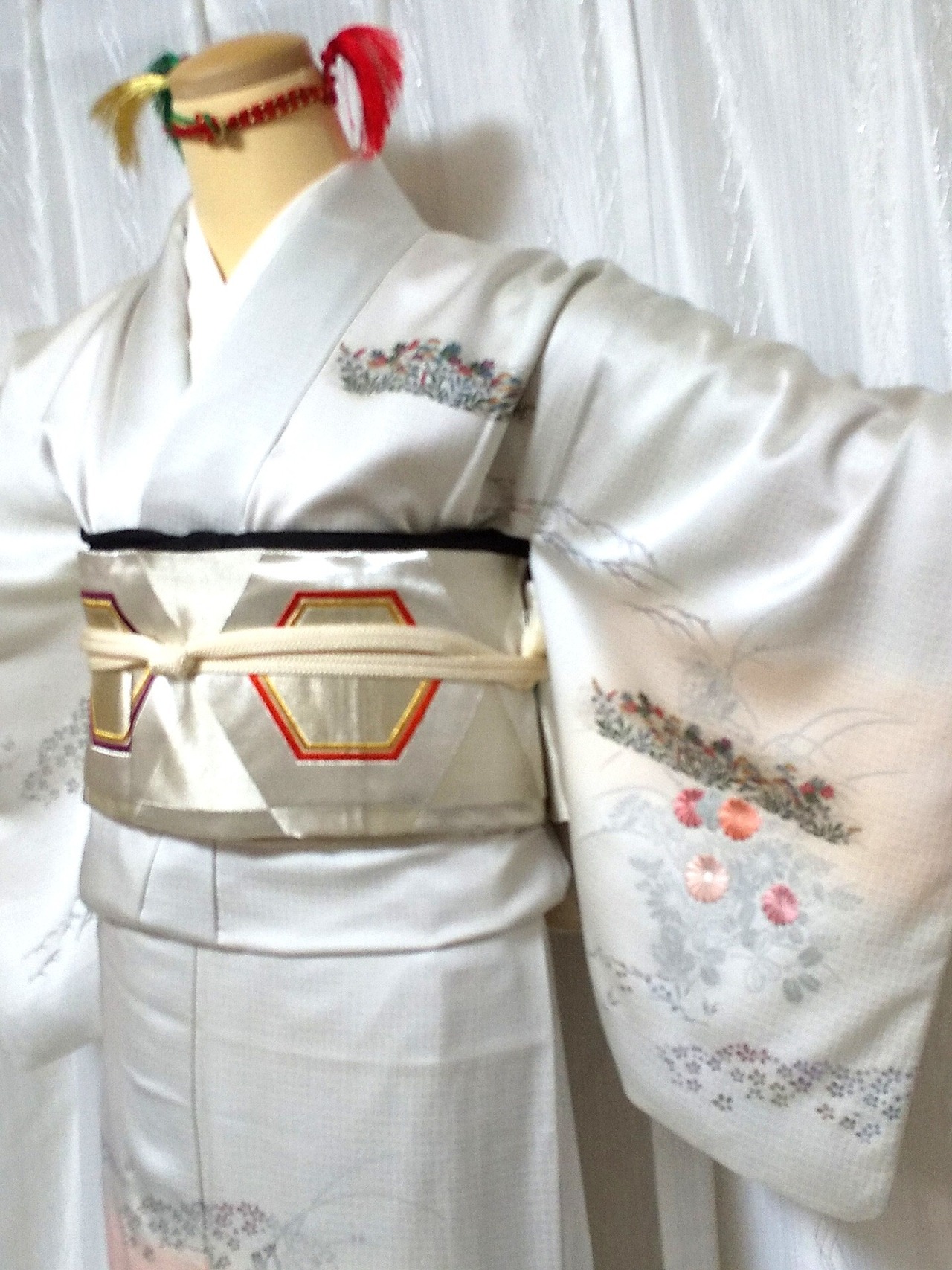 出品に際し二重太鼓結び、飾り結びをしたので、使用によるシワがついてしまいました。その為、商品価値が落ちましたが、高級な正絹の金銀使用の20万円する帶ですので、大変お得です☆