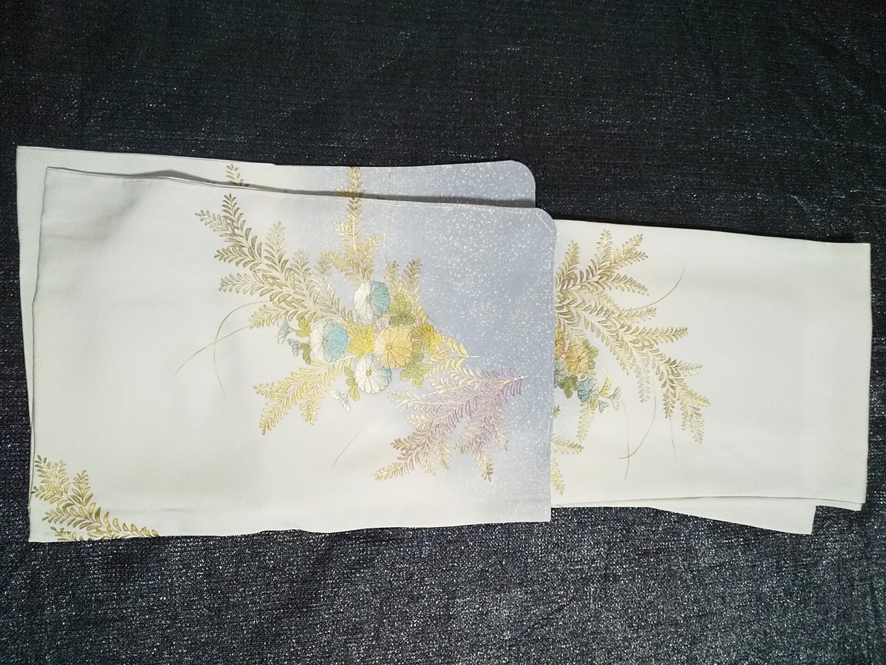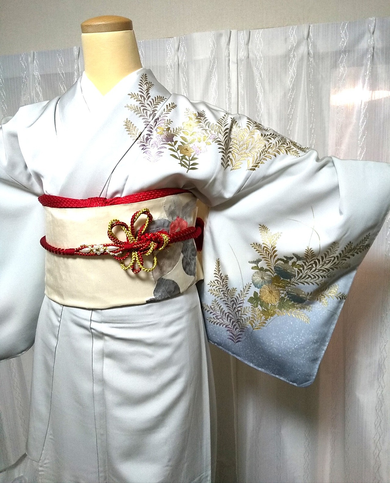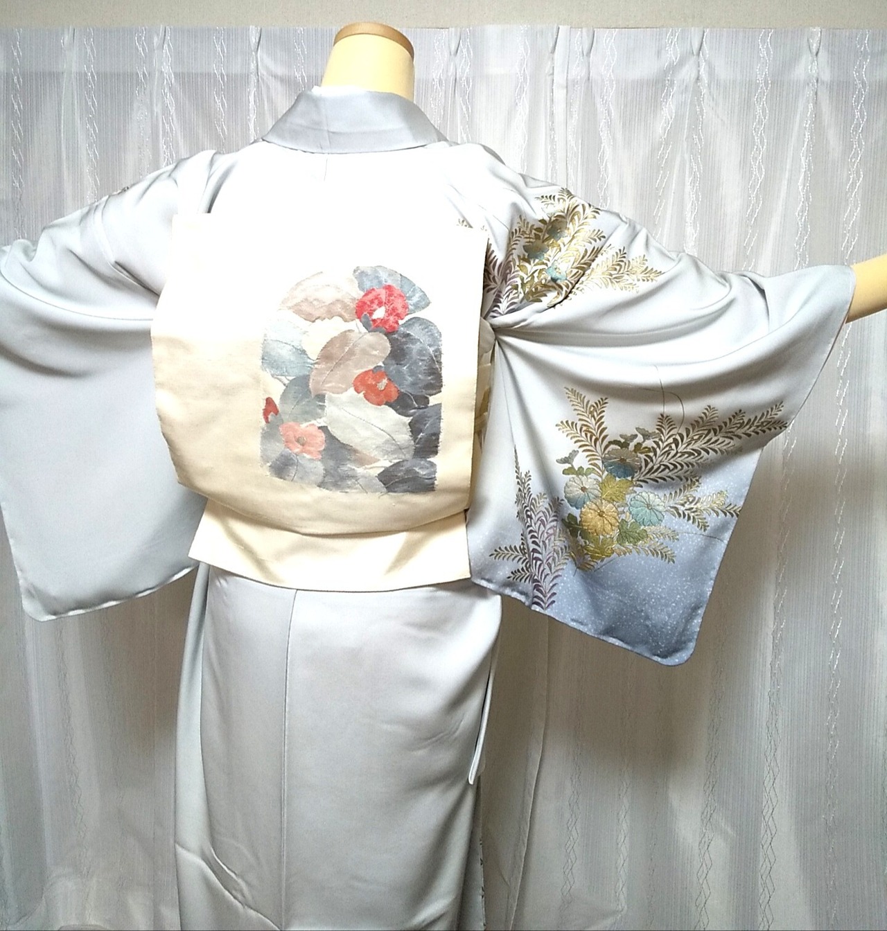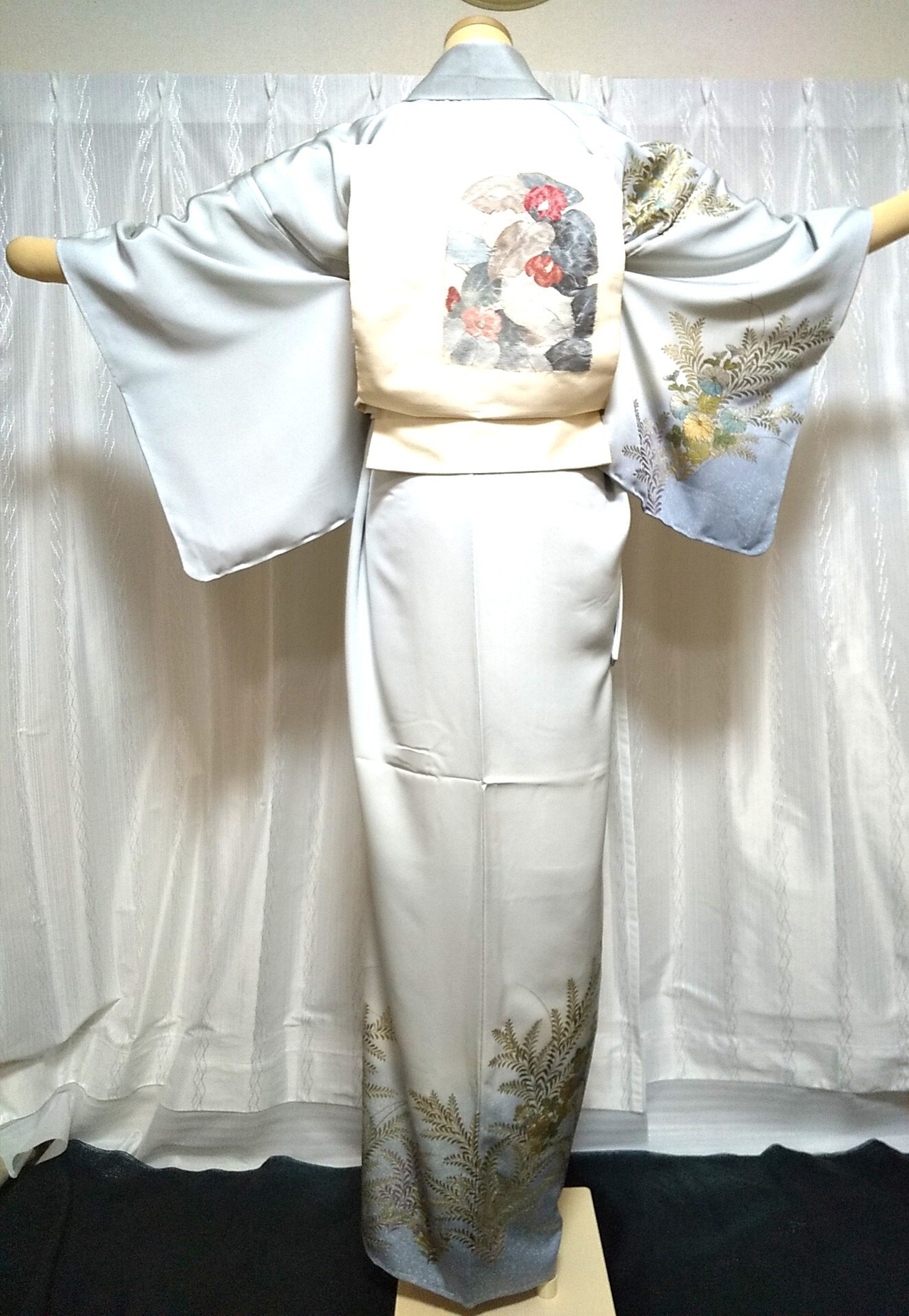 おはしょりを作らず対丈にて着付けしました。イメージで使用した帯類は付きません。お着物のみの発送です。