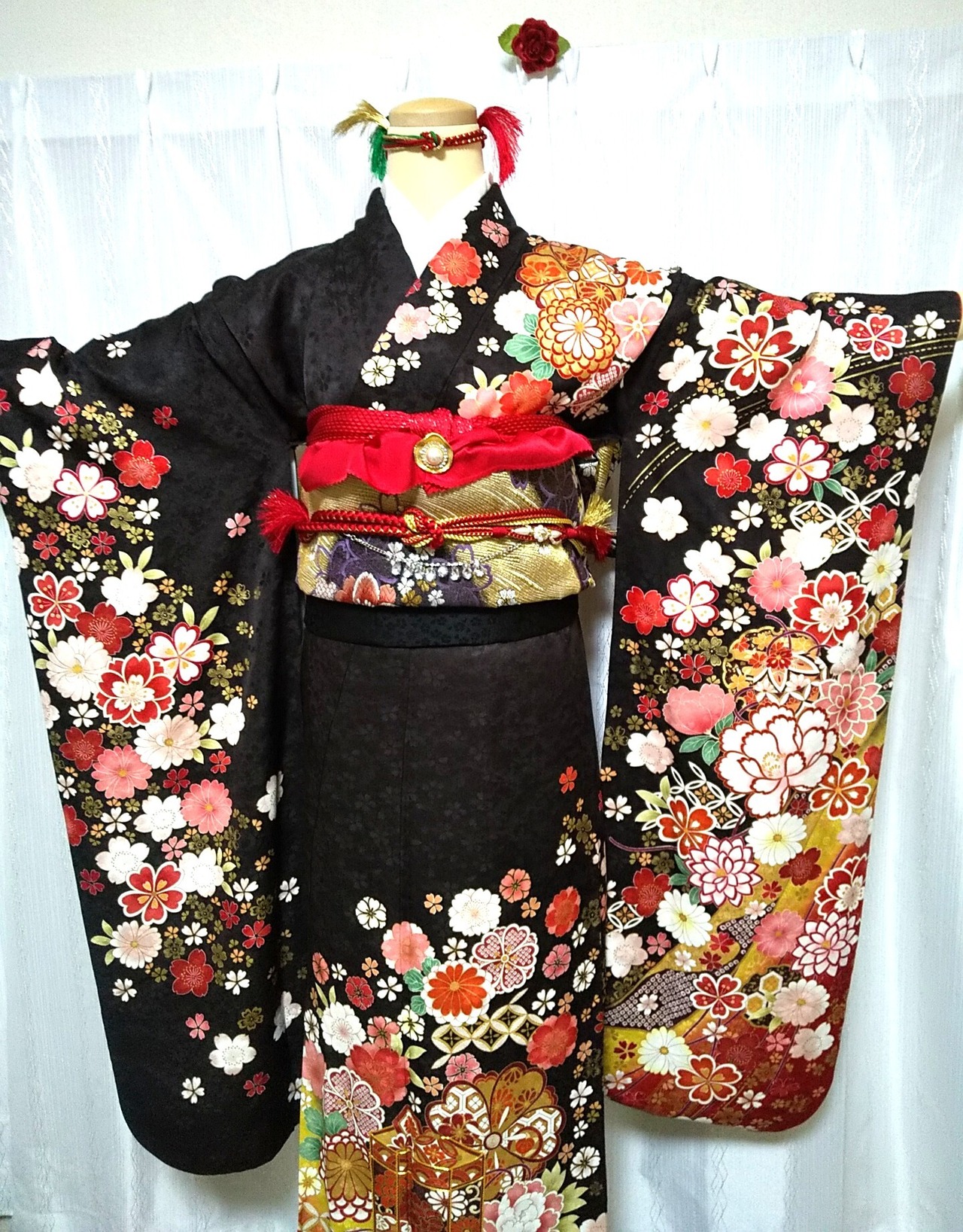 高級振袖 正絹 花柄 黒基調×赤 美品