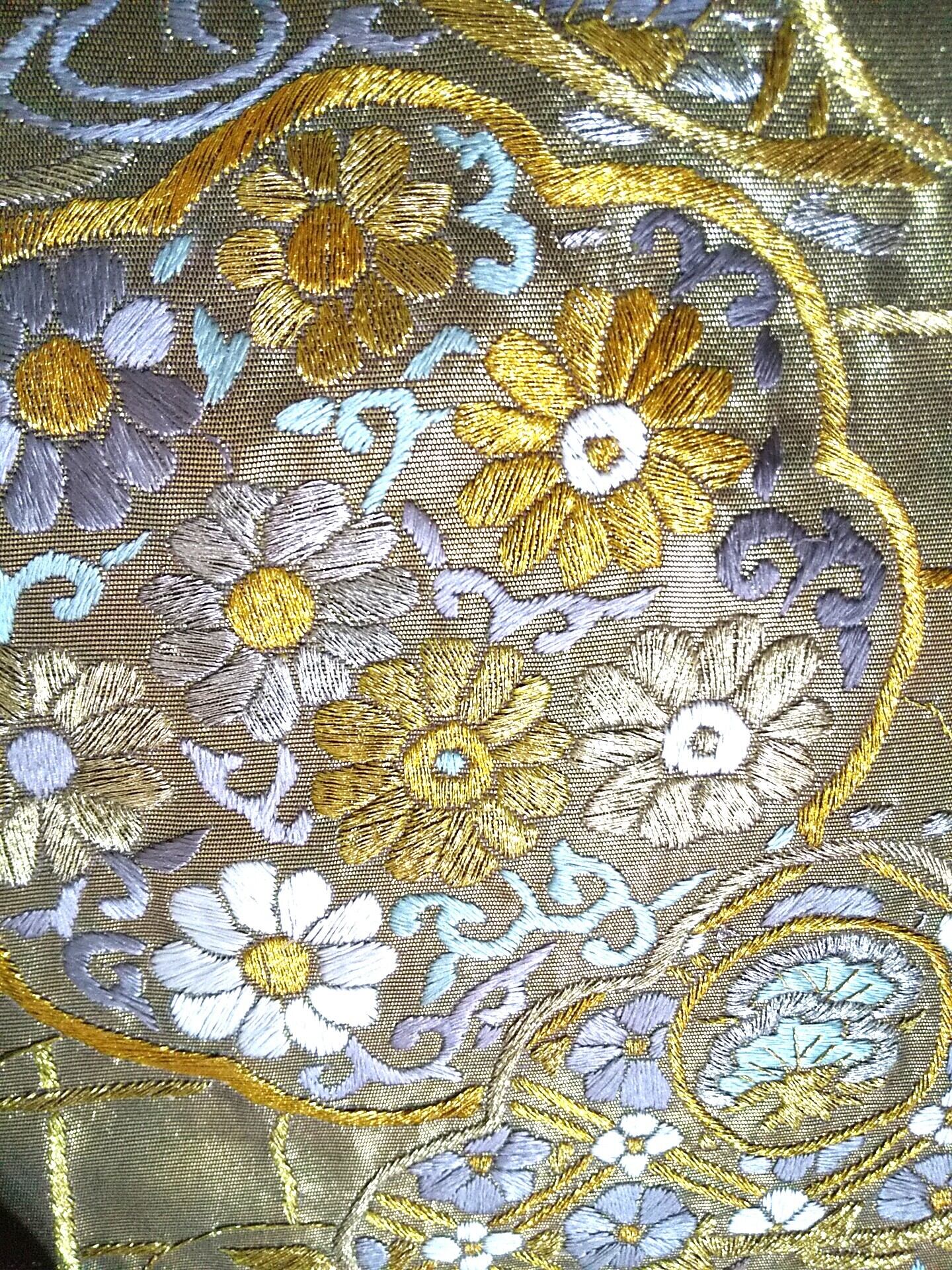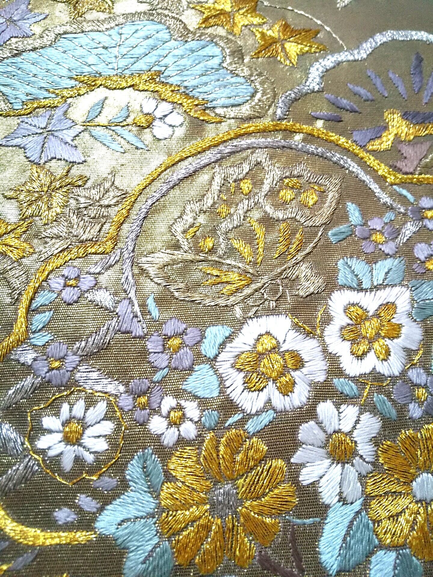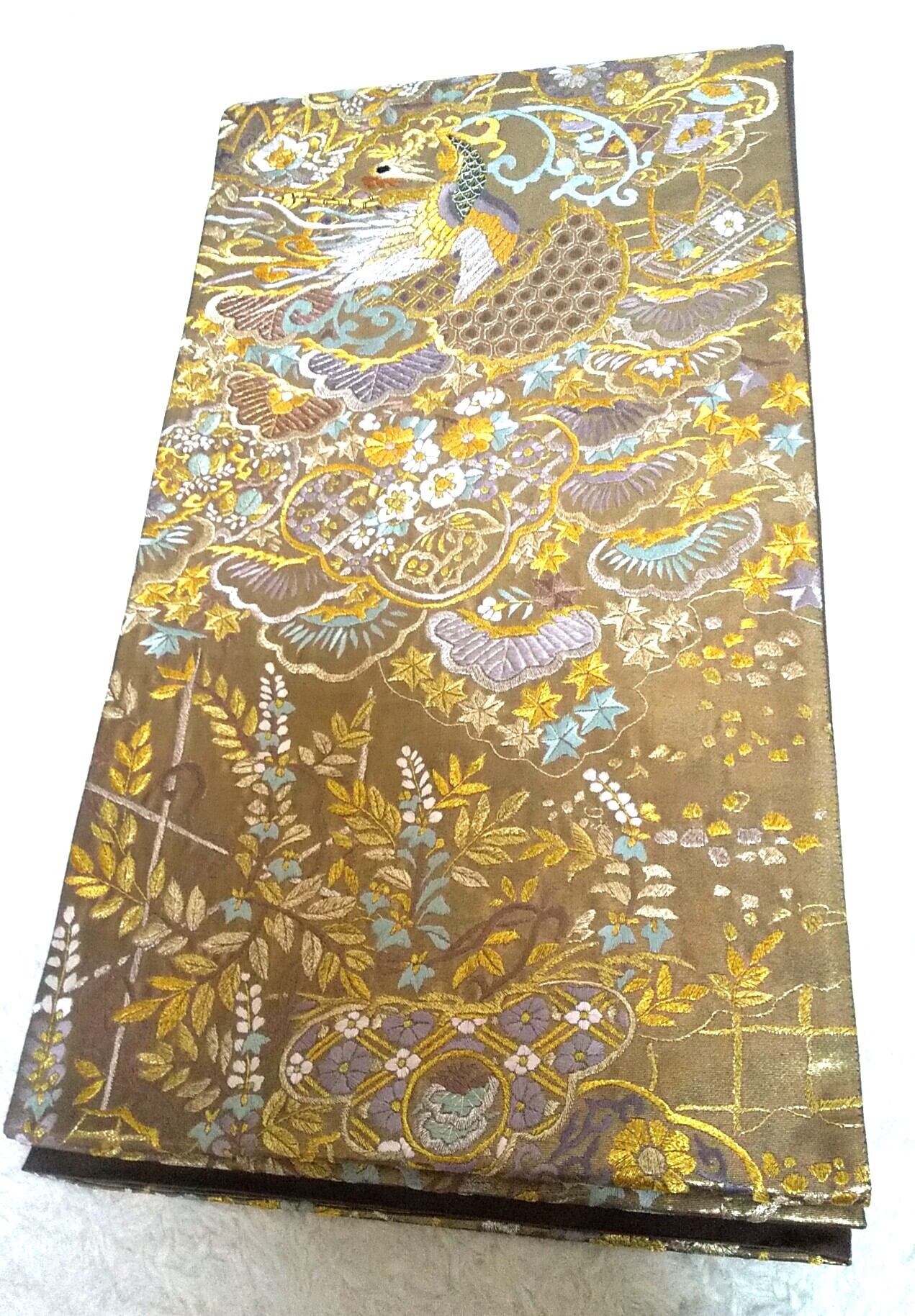 金色をベースに火の鳥やお花の柄が入ったとても眩しいゴールド系の袋帯です☆